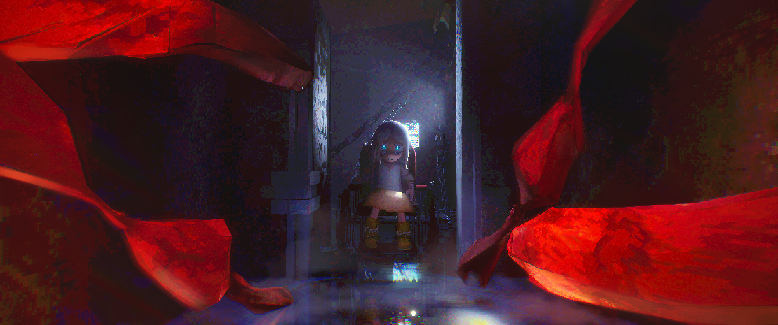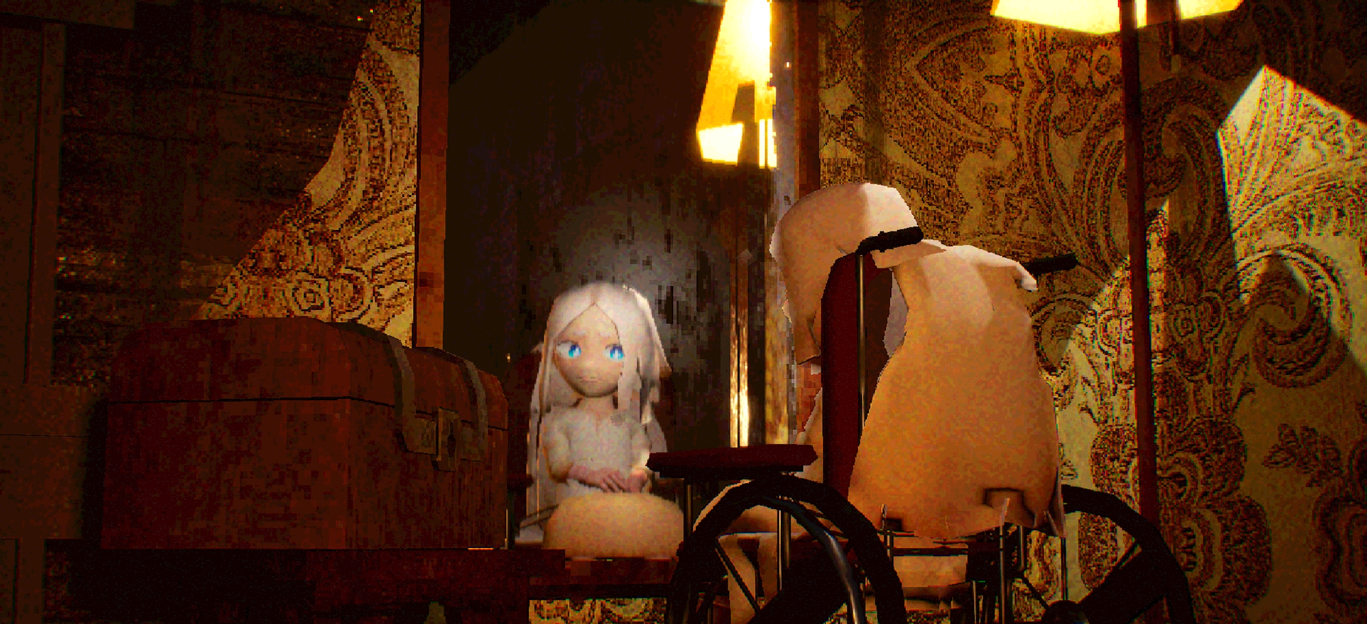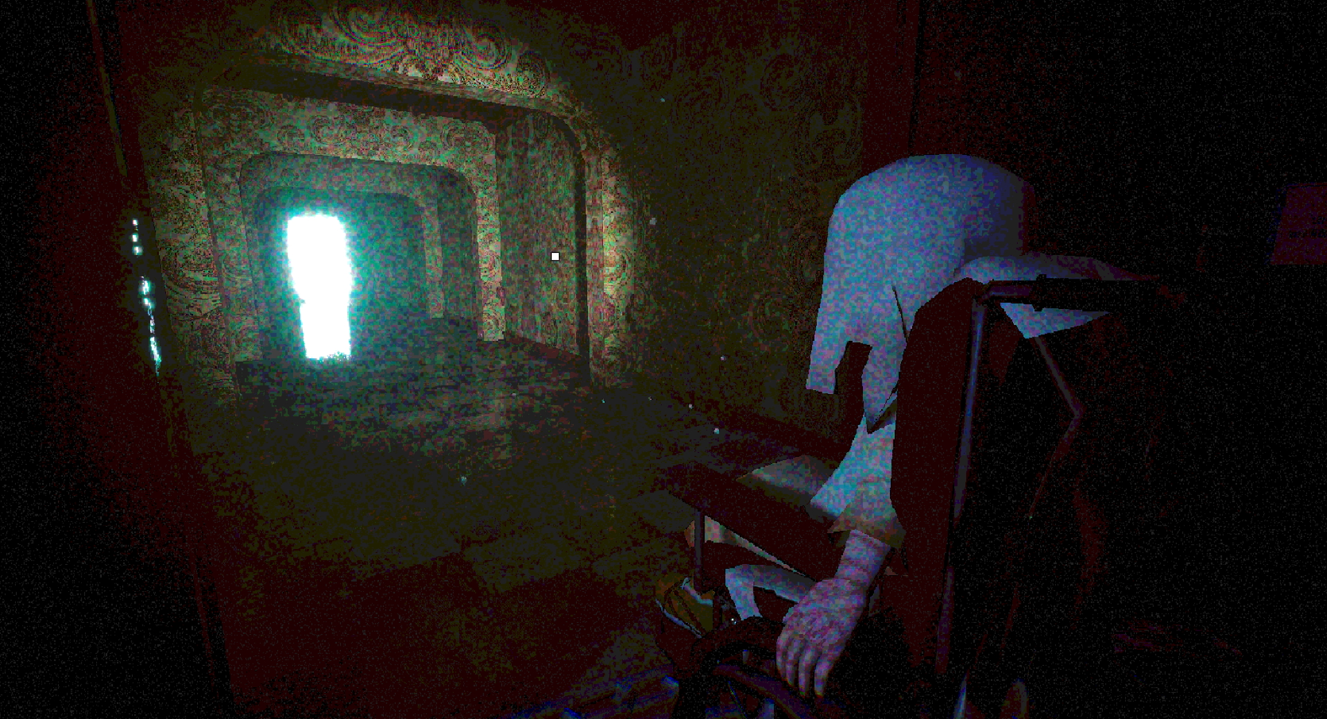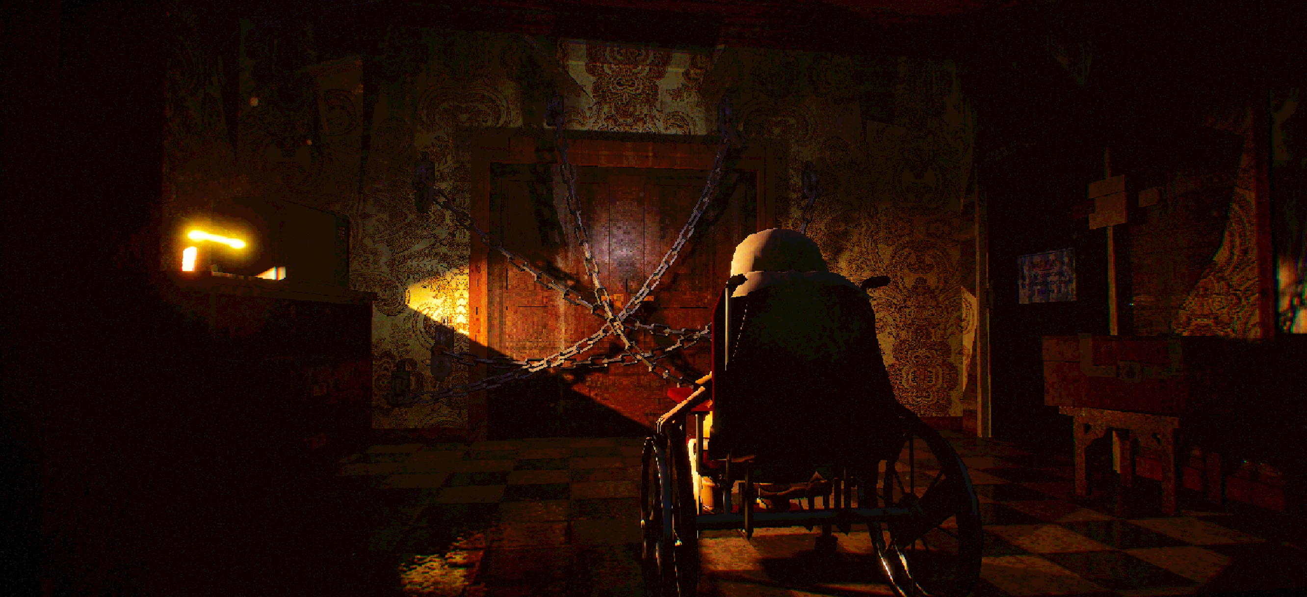 You are trapped in a locked room, tied tightly within your rusty wheelchair.